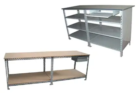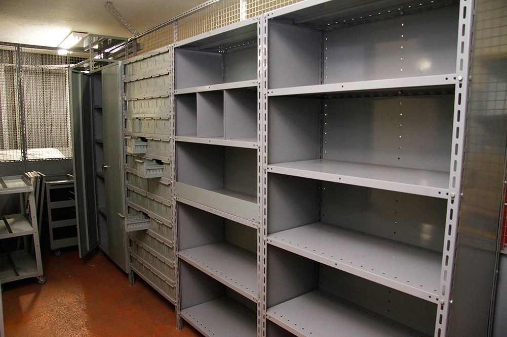 As estantes de aço são confeccionadas em cantoneiras perfuradas e prateleiras em chapas dobradas. Possuem acessórios opcionais como: portas, fechamentos laterais, fundo, divisores, retentores e gavetas, recebe pintura epóxi.
